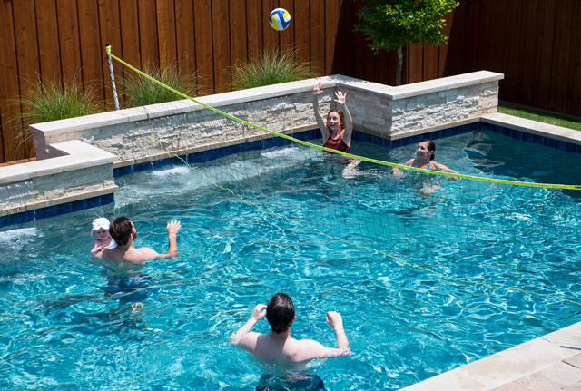 سوراخ های تور والیبال استخری مربعی شکل بوده و اندازه آن ها 10 سانتی متر است. کناره های تور والیبال با پارچه ای از جنس کتان دوخته شده و ضخامت آن 5 سانتی متر می باشد.